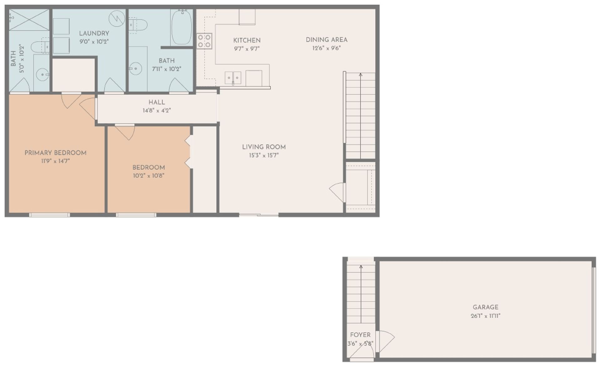 2 Bedroom, 2 Bath Upper Level Townhome with Private Entrance, Attached Garage, and In-Home Laundry